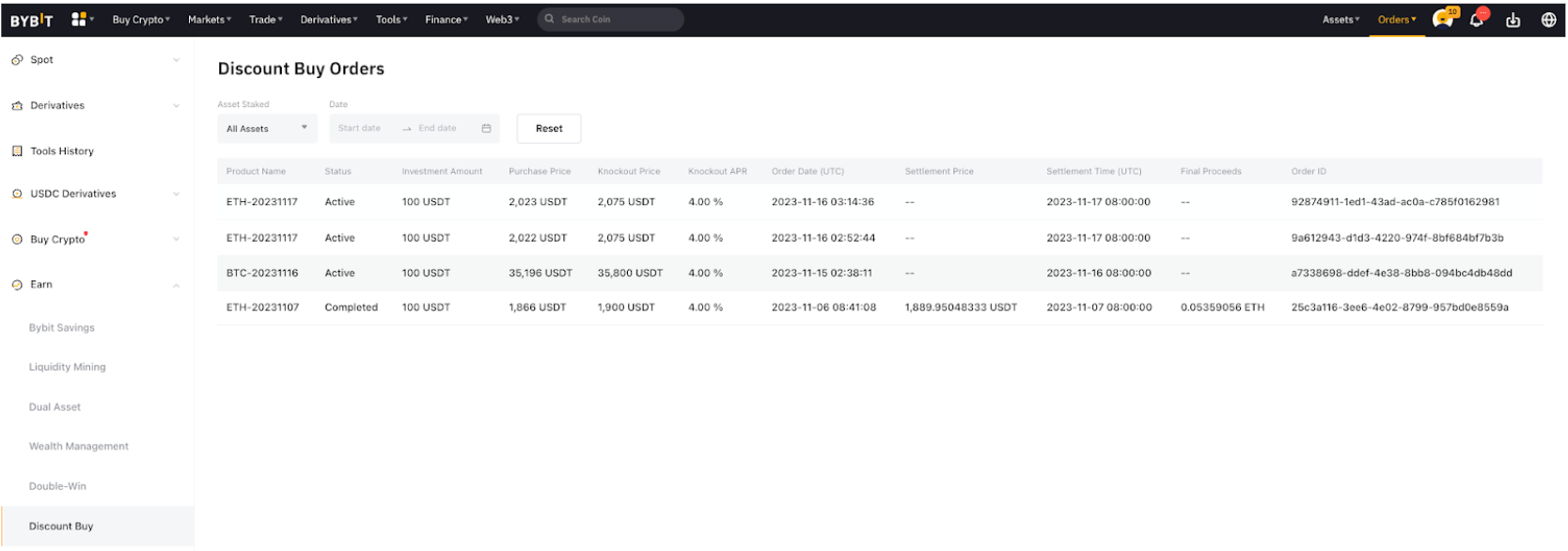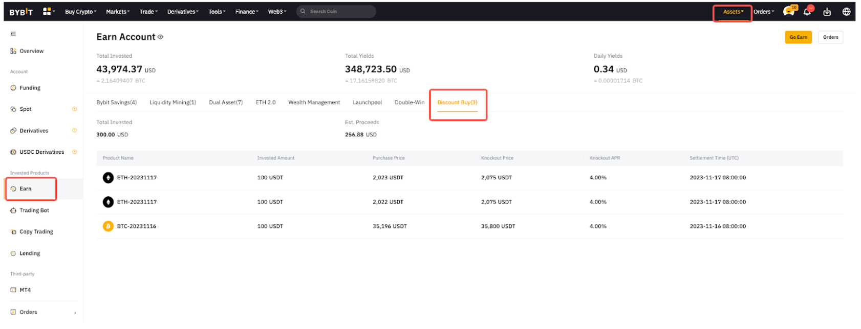 或者,點擊 Bybit 頁面右上角的資產,進入理財賬戶頁面,在此即可查看當前訂單。