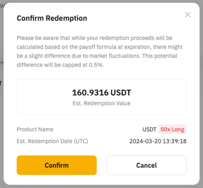 第 2 步:點擊相應槓桿無憂計畫右側的贖回按鈕,將會彈出一個確認窗口。請仔細核對贖回詳情,然後點擊確認按鈕。