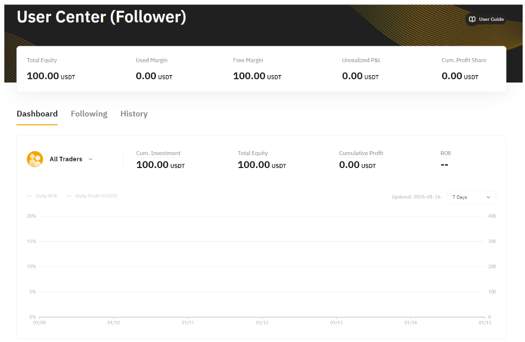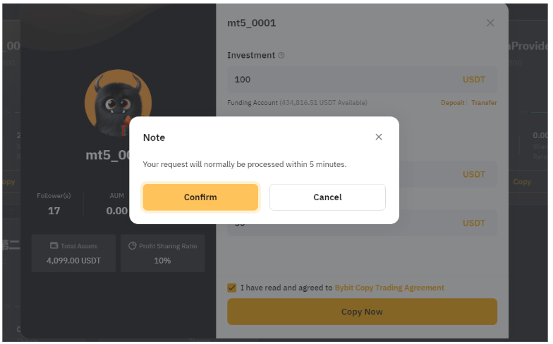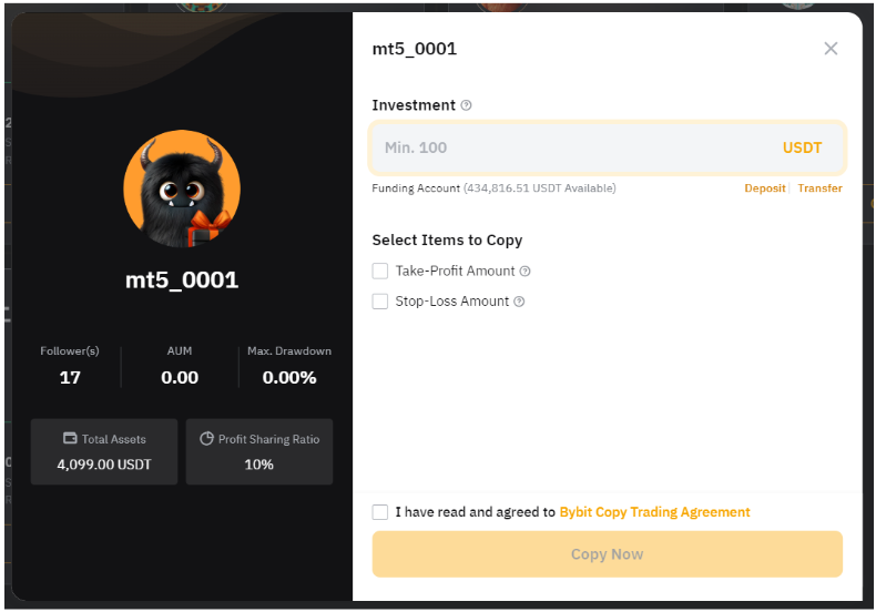投資額:跟單用戶的最低投資額為 100 USDx,最高投資額為 1,000,000 USDx。請注意,您的交易達人可以針對最低跟單金額設置更高的要求,該字段中將顯示最低金額。