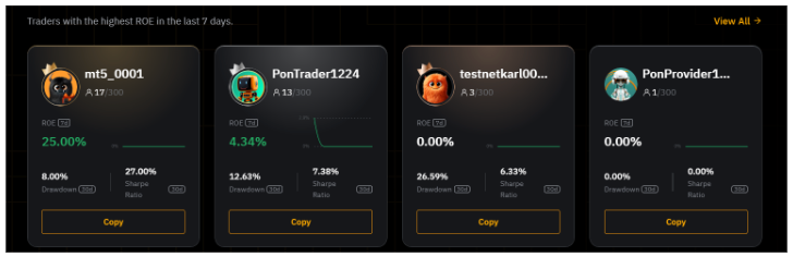 在此窗口中,您還可以查看交易達人的表現和分潤比例。分潤比例根據交易達人的等級而異。如果分潤比例為 10%,則意味着跟單用戶需要將其在對交易達人進行跟單時所賺的累計淨收益的 10% 分給相應的交易達人。