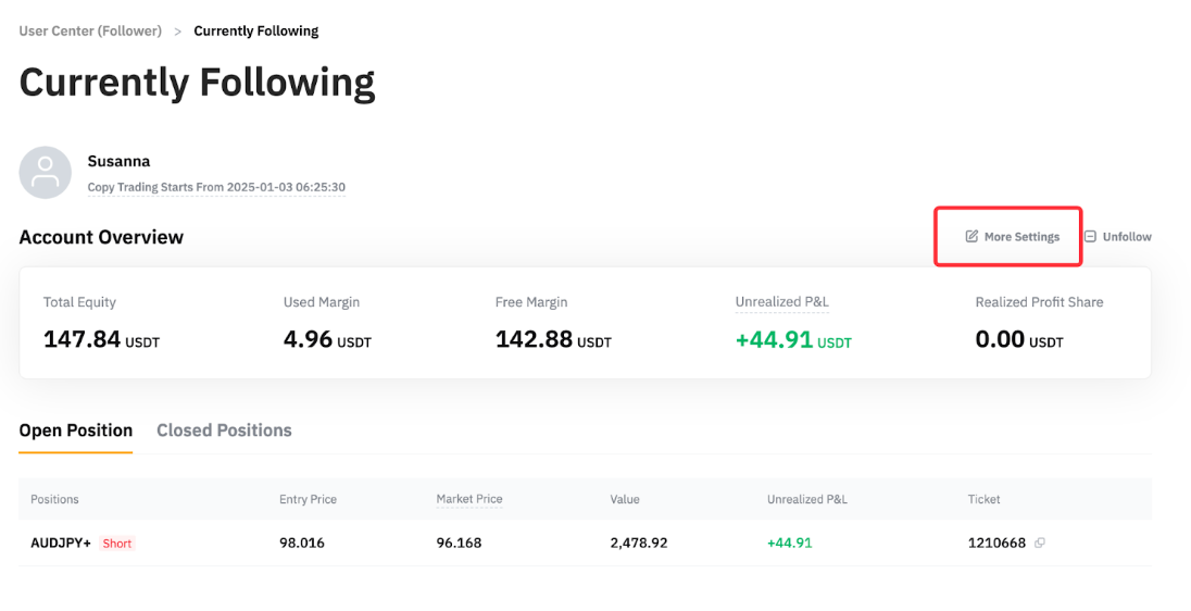 第 3 步:前往當前跟單頁面,點擊更多設置。您可以更新止盈和止損額,然後點擊修改跟單參數