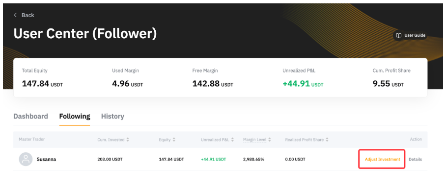 第 1 步:進入跟單用戶中心跟單中調整投資額。然後,點擊追加投資額減少投資額。減少投資額的請求一旦提交,則無法撤銷。