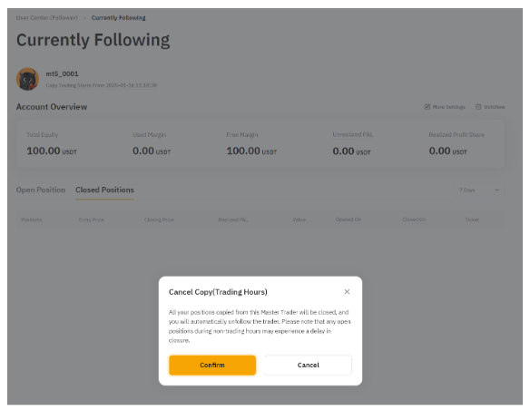 請注意,當您對交易達人取消跟單時,您跟隨的所有倉位都將平倉。請注意,非交易時段內倉位的平倉可能出現延遲。