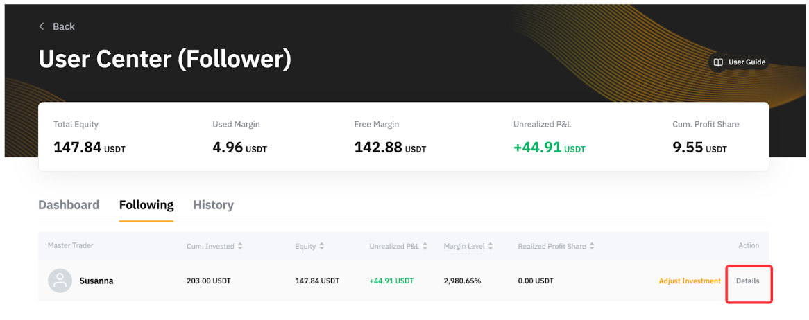 第 2 步:跟單中選項卡下方,點擊您跟隨的交易達人的詳情