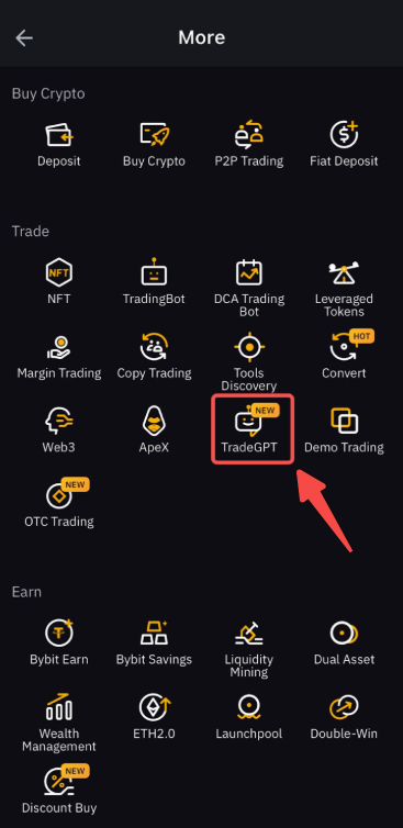 在 Bybit App 端,點擊 Bybit 首頁上的更多並選擇 TradeGPT 即可訪問 TradeGPT。