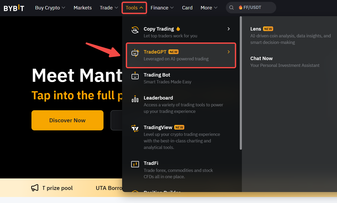 在 Bybit 網頁端,只需點擊此鏈接或在 Bybit 頁面導航欄中點擊工具,然後選擇 TradeGPT 即可。