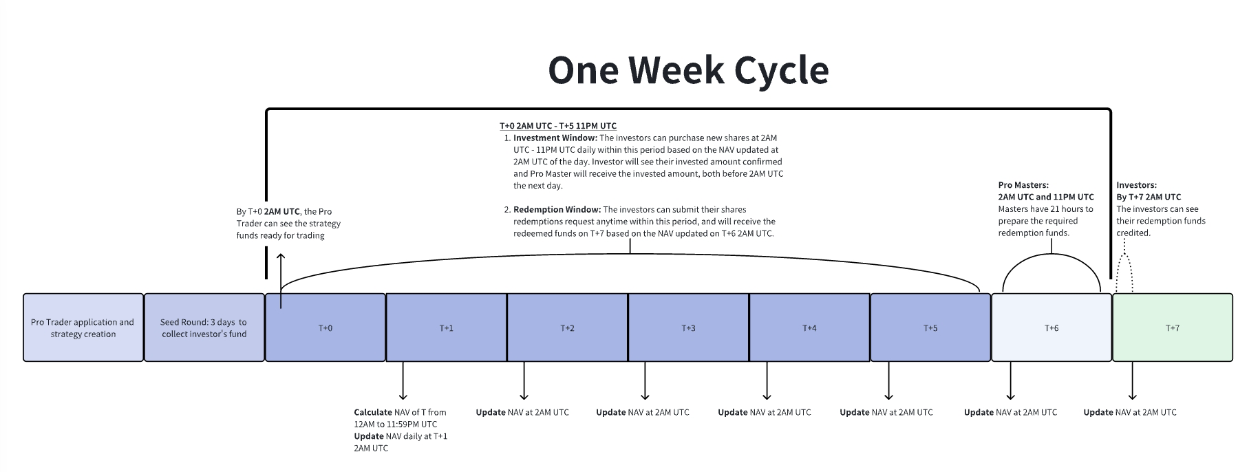 假設「T」落在週一:投資者可以在週一至週六的 UTC 凌晨 2 點至 UTC 晚上 11 點之間購買額外股份。若要贖回股份,投資人可以在週一 UTC 凌晨 2 點至週六 UTC 晚上 11 點之間隨時提交贖回請求。 Pro 達人會在周日整理所需的贖回資金,並在下週一之前將資金記入投資者的帳戶。